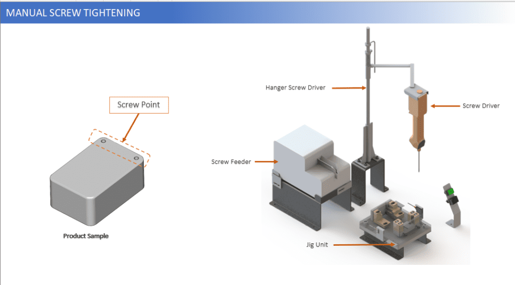 This screw tightening machine is manual operated machine. Operator set up the product into jig and moving the hanger of screw driver manually into product. Because of this manual operation, it is possible to screwing of product with multiple scew point position. |